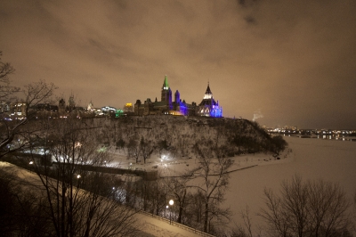 Canadian Parliament at winter night shot. Temperature is very low, probably below -30C